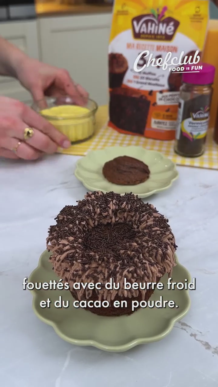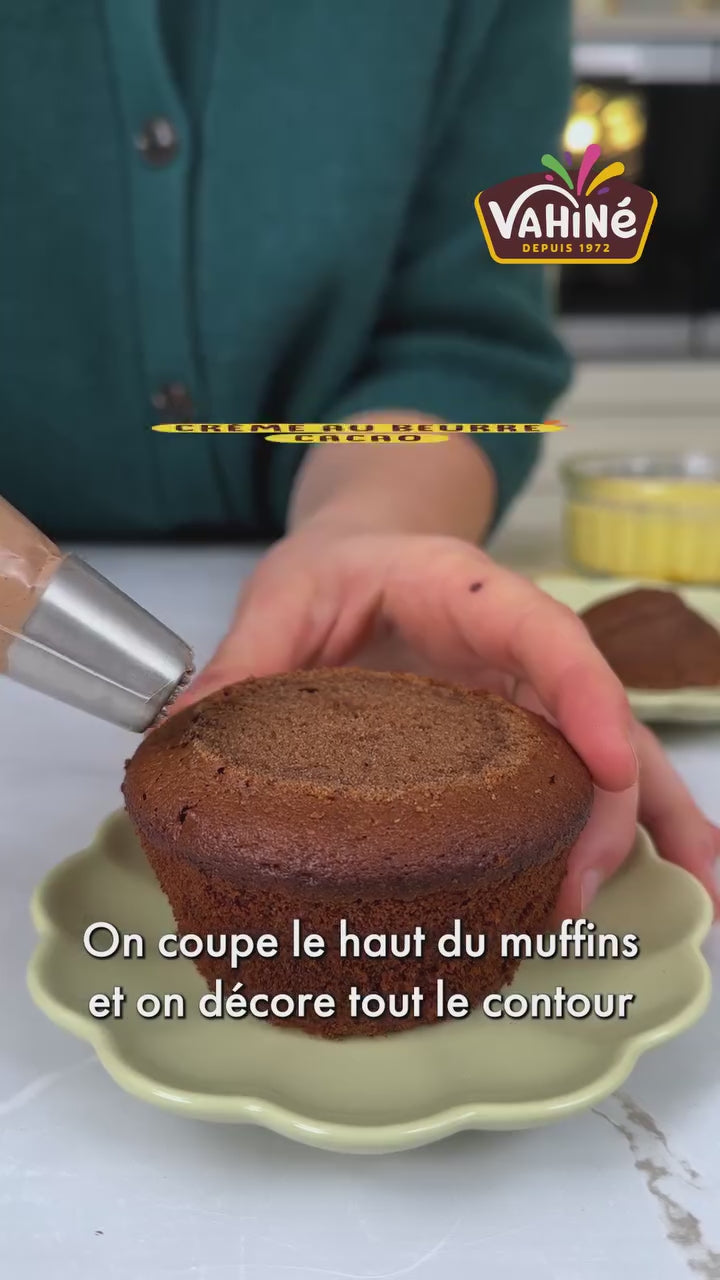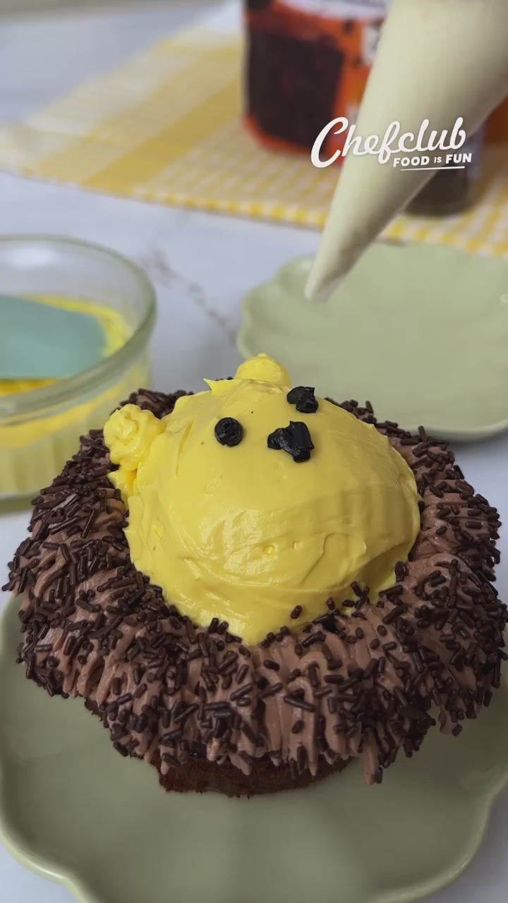- Coupez le haut du muffin afin de l'aplanir. Décorez le tour avec la crème marron et les vermicelles multicolores. Recouvrez le chapeau de crème jaune et replacez-le.