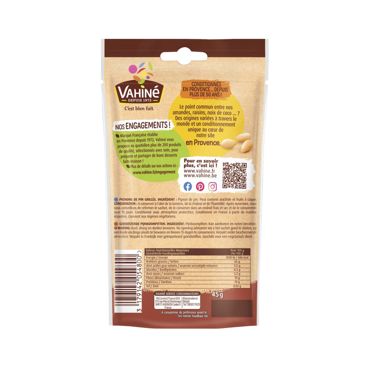 Plus de 50 ans d'expertise pâtissière Vahiné ! Vahiné a sélectionné ces pignons de pin grillés pour leur croquant et leur saveur boisée, délicatement relevée par la torréfaction. Fini le temps des pignons brûlés dans la poêle : avec Vahiné, c'est désormais la garantie de réussite ! Vahiné, c'est gonflé !