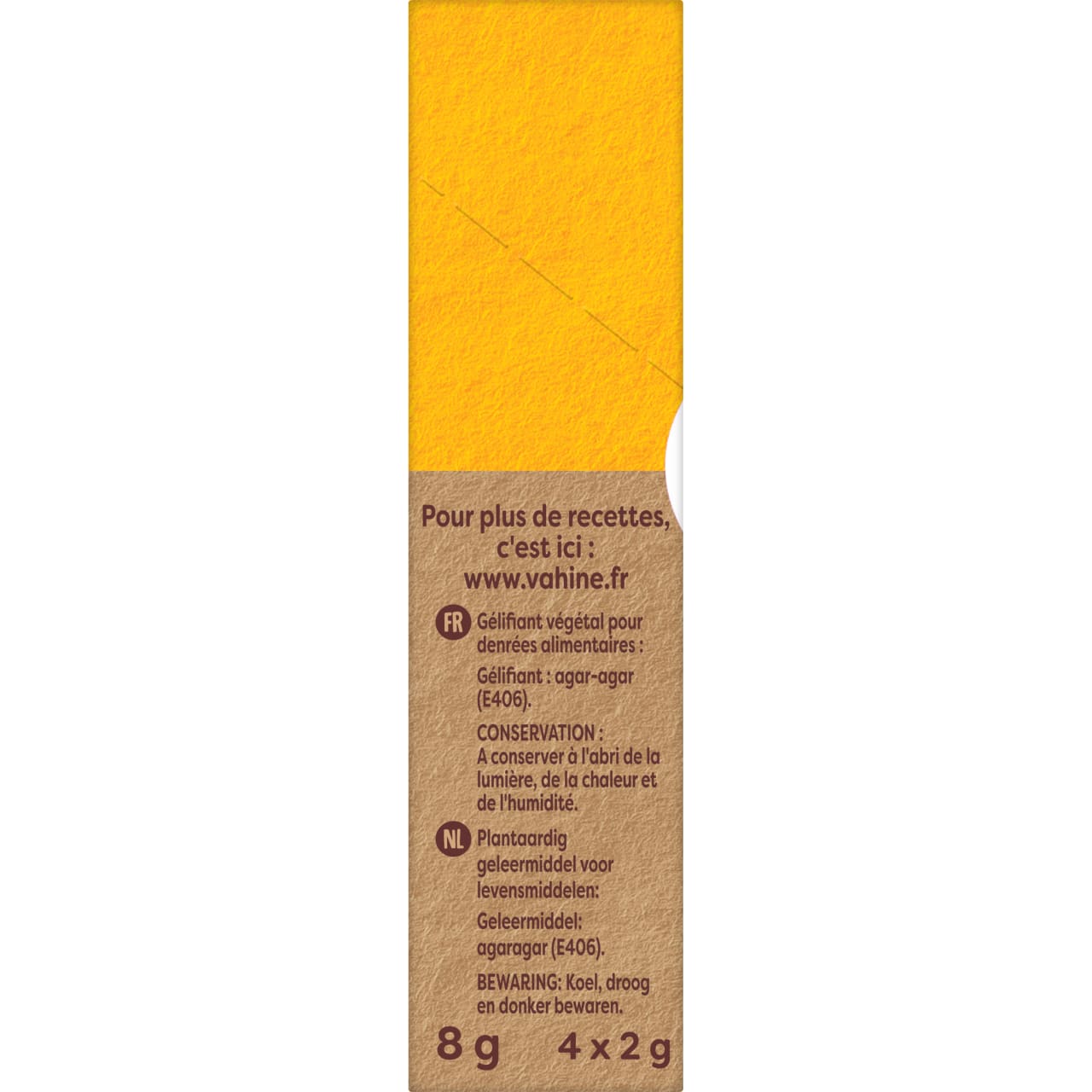 Vahiné vous propose l'Agar-agar en poudre pour apporter de la tenue et du fondant à tous vos desserts (crèmes, mousses, gelées, panna cottas, sorbets, glaces...) et vous donne tous les secrets de son utilisation en pâtisserie. Incolore et inodore, ce gélifiant 100% d'origine végétale est extrait d'algues marines et représente une excellente alternative à la gélatine alimentaire classique. Il peut vous aider à diminuer la valeur calorique de vos desserts: moins de sucre, moins de beurre. Conditionné en France. Gélifiant végétal pour denrées alimentaires : Agar-agar (E406). 4 sachets de 2g.