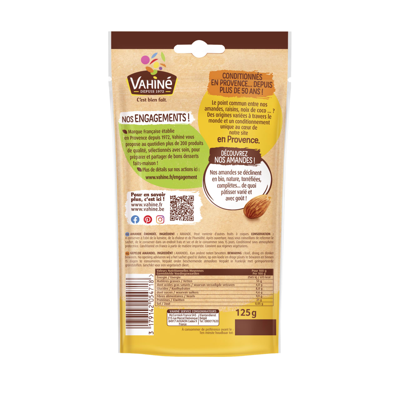 Plus de 40 ans d'expertise pâtissière Vahiné ! Vahiné a rigoureusement sélectionné ces amandes pour leur qualité et leur finesse. Naturelles ou grillées, ces amandes émondées apporteront une textur....