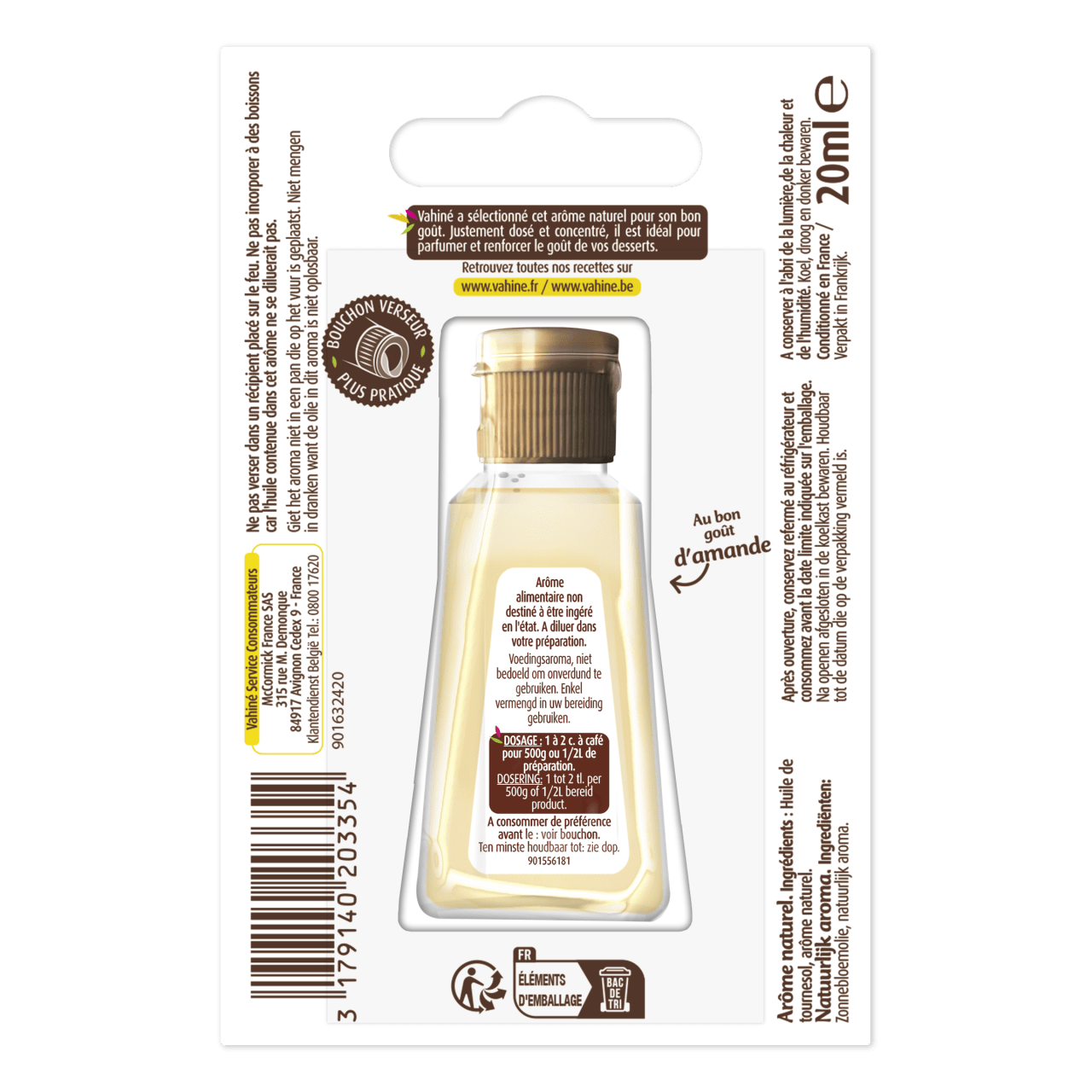 Vahiné a sélectionné cet arôme amande amère pour sa qualité et son bon goût. Justement dosé et concentré, il est idéal pour parfumer et renforcer le goût de vos desserts aux fruits ou au chocolat. ....