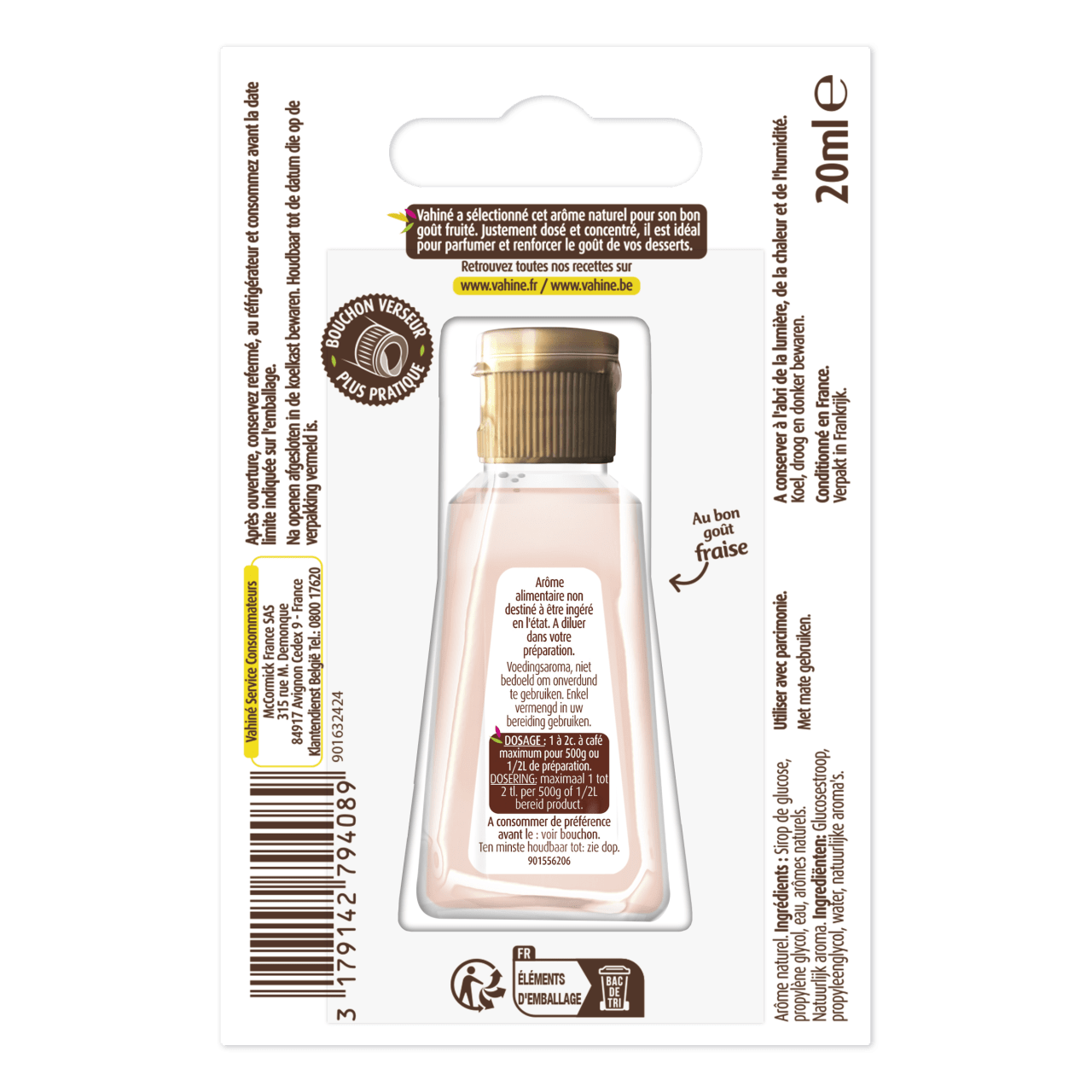 Vahiné a sélectionné cet arôme fraise pour sa qualité et son bon goût fruité. Justement dosé et concentré, il est idéal pour parfumer et renforcer le goût de vos desserts et entremets (mousses, bav....
