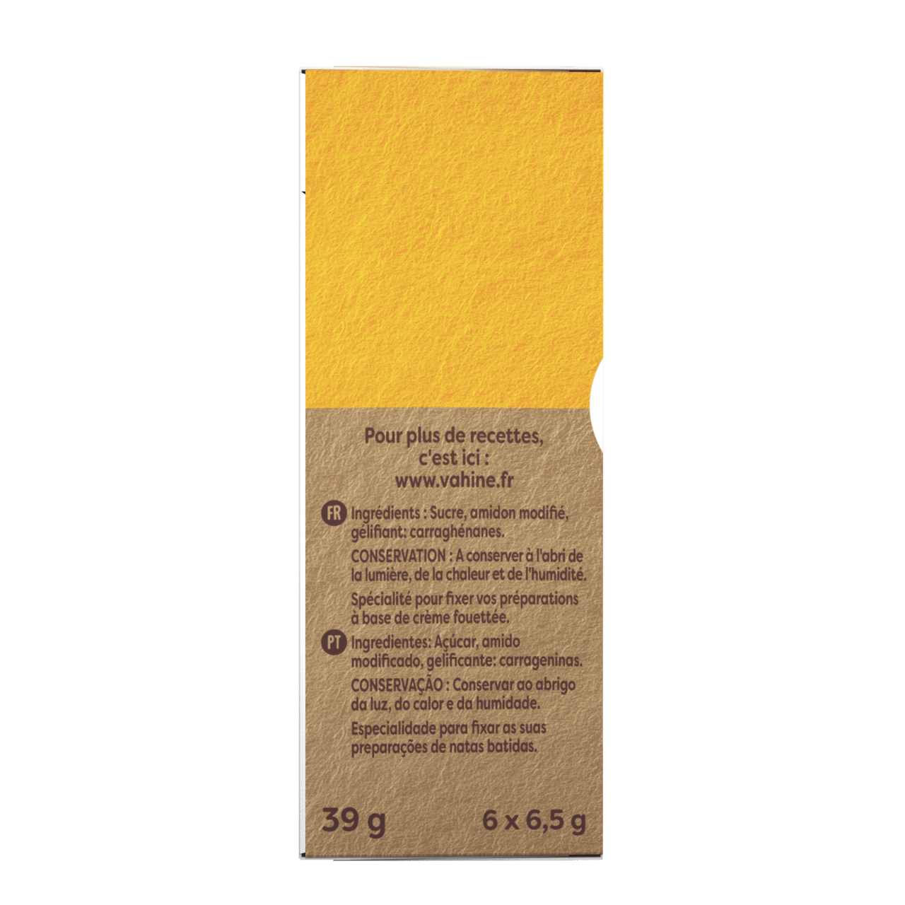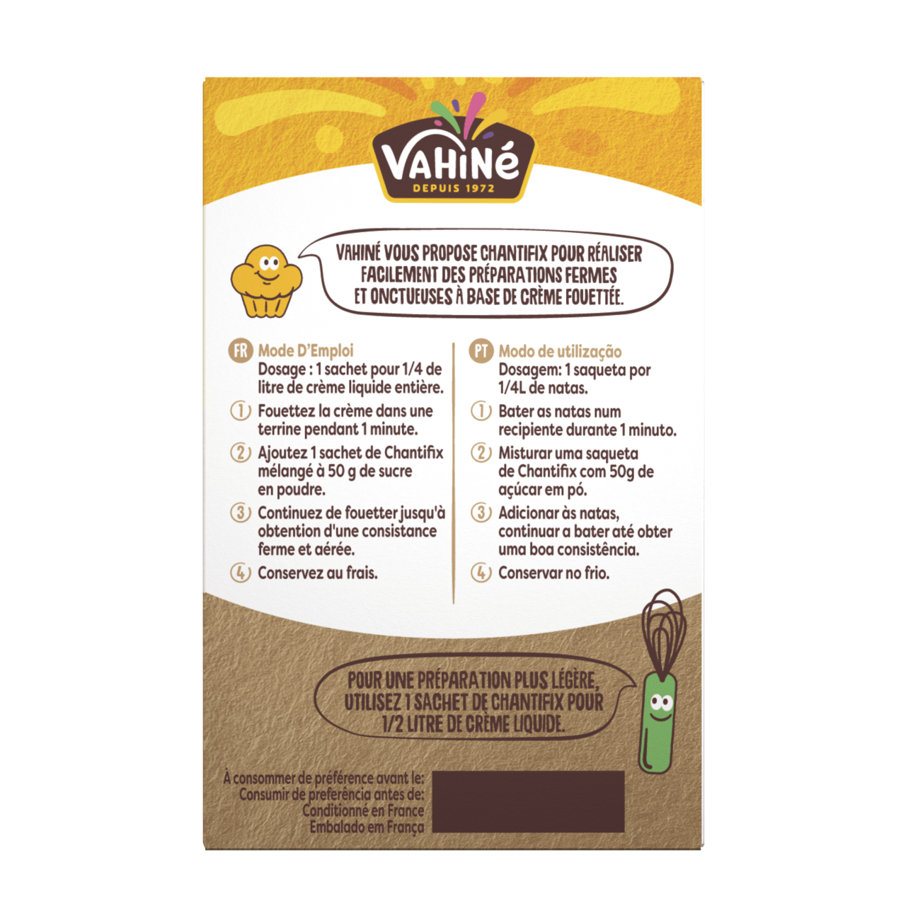 Pour une préparation plus légère, utilisez un sachet de Chantifix pour 1/2 litre de crème fraîche, ajoutez 1 sachet de sucre Vanillé Vahiné.