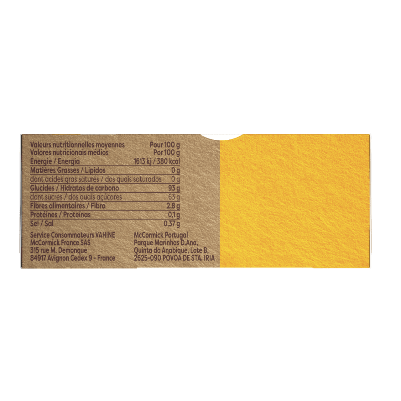 Sucre, amidon modifié, gélifiant: carraghénanes, arôme.