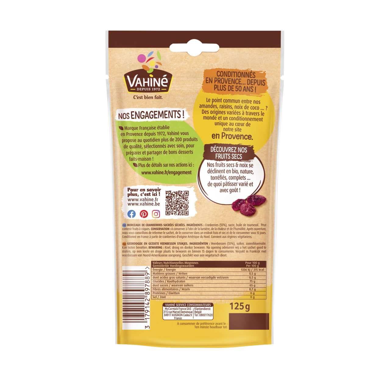 Vahiné a sélectionné pour vous ces Cranberries (canneberges). Source de fibres, les cranberries séchées sont une alternative moderne, colorée et savoureuse aux raisins secs. Ajoutez-les dans vos de....