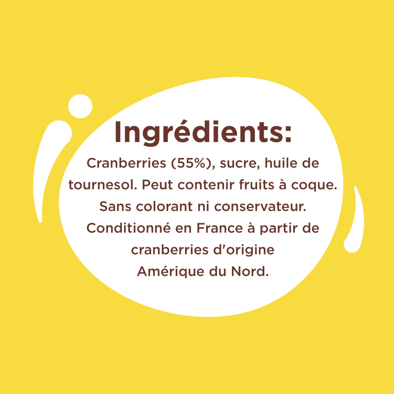 Cranberries (55%), sucre, huile de tournesol. Peut contenir fruits à coque. Sans colorant ni conservateur. Conditionné en France à partir de cranberries d'origine Amérique du Nord.