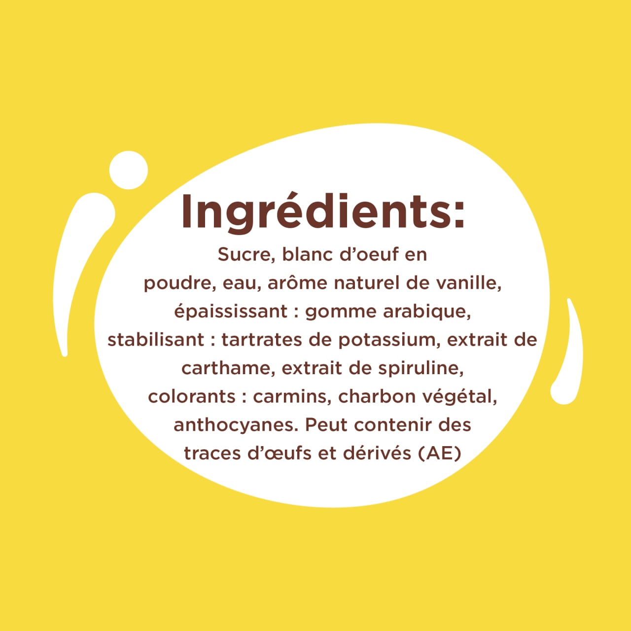 Sucre, blanc d’oeuf en poudre, eau, arôme naturel de vanille, épaississant : gomme arabique, stabilisant : tartrates de potassium, extrait de carthame, extrait de spiruline, colorants : carmins, charbon végétal, anthocyanes.