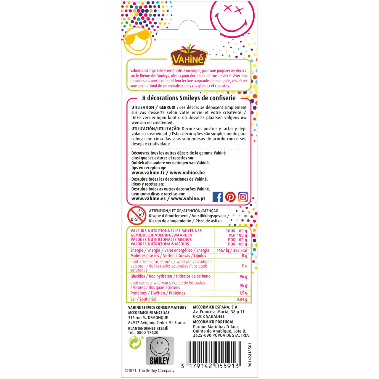 Vahiné s'est inspiré de la recette de la meringue, pour vous proposer ces décors sur le thème des Smileys®, idéaux pour décoration de vos desserts. Avec leur formule sans conservateur et leur texture craquante et meringuée, ces décors vous permettront de personnaliser tous vos gâteaux et cupcakes. Ces 8 décorations Smiley® de confiserie sont sans conservateur, sans colorant artificiel et à l'arôme naturel. ©1971. The Smiley Company