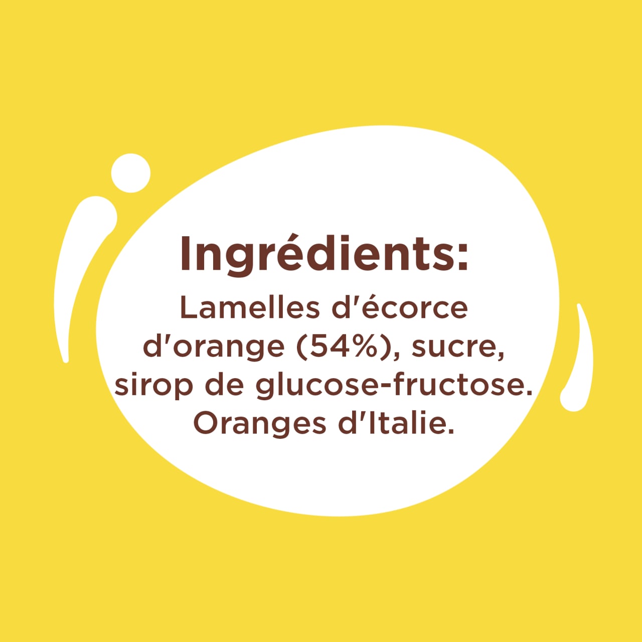 Lamelles d'écorce d'orange (54%), sucre, sirop de glucose-fructose.