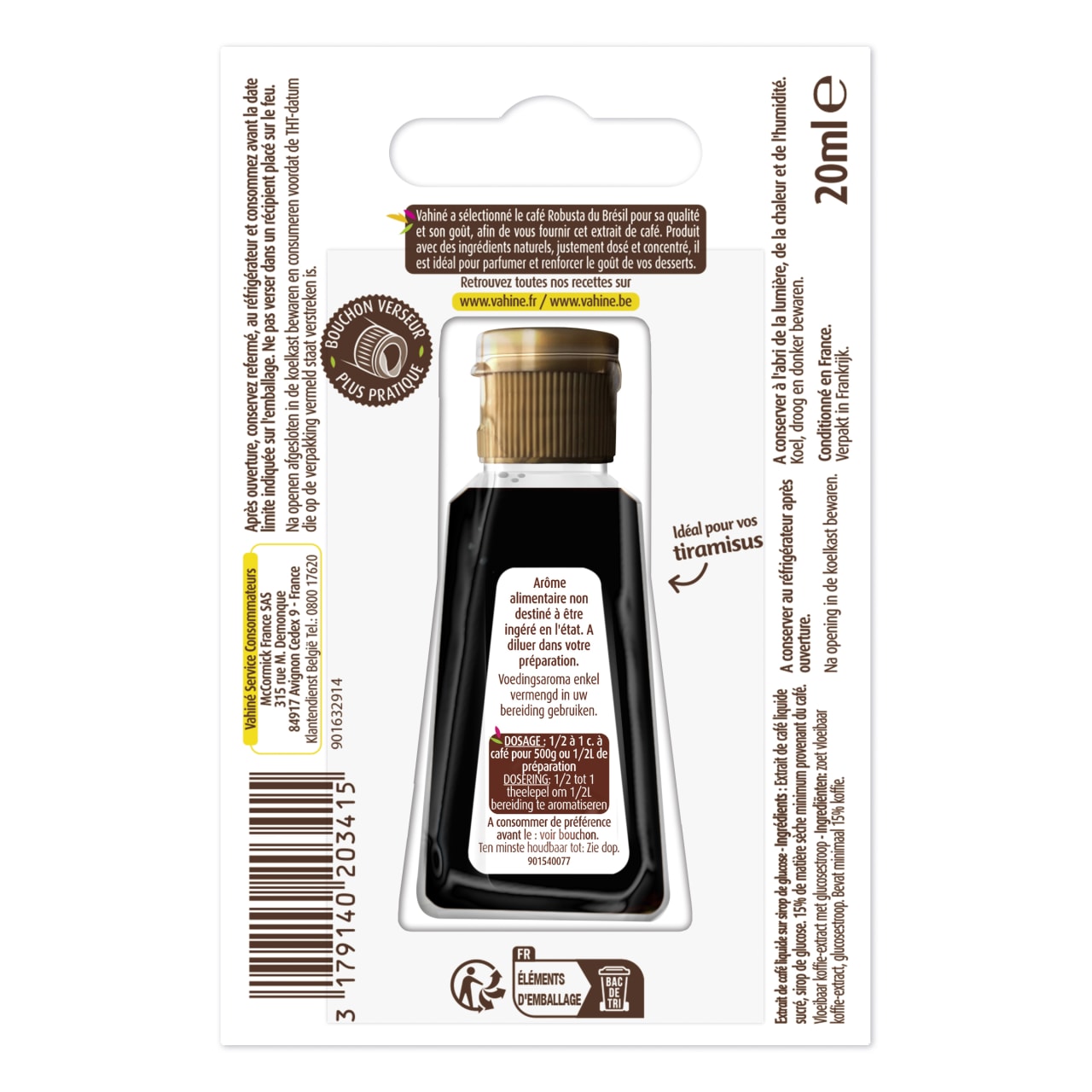 Café 100% Robusta Brésil ! Cet extrait de café à l'extrait naturel apportera aux préparations pâtissières une note subtile de café. Associé au chocolat, il relève avec délice les mousses ou fondants et est idéal pour intensifier le goût de café de vos tiramisus. Il est aussi 100% pratique avec son bouchon verseur ! Conditionné en France.