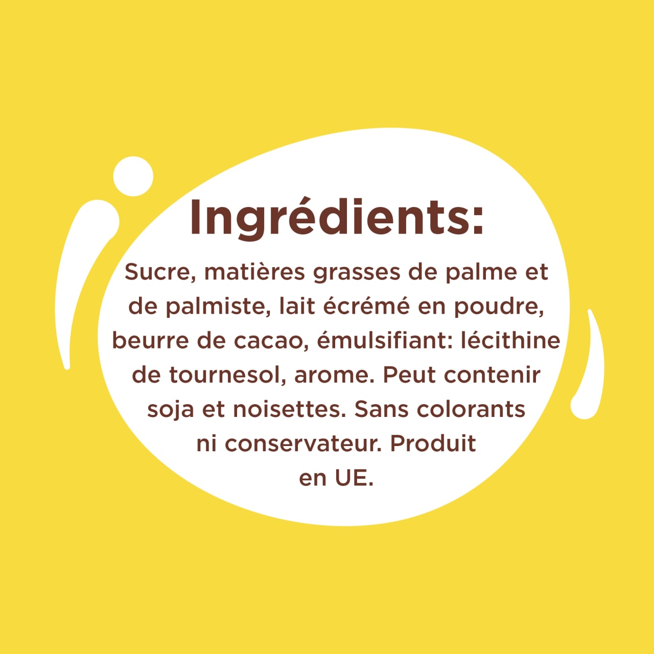 Sucre, matières grasses de palme et de palmiste, lait écrémé en poudre, beurre de cacao, émulsifiant: lécithine de tournesol, arome. Peut contenir soja et noisettes.