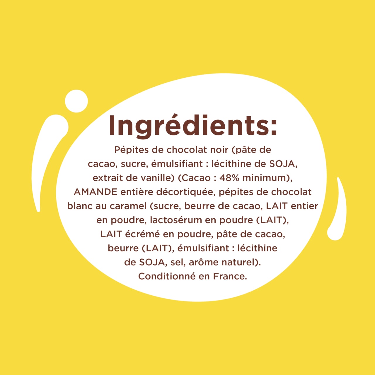 Pépites de chocolat noir (pâte de cacao, sucre, émulsifiant : lécithine de SOJA, extrait de vanille) (Cacao : 48% minimum), AMANDE entière décortiquée, pépites de chocolat blanc au caramel (sucre, beurre de cacao, LAIT entier en poudre, lactosérum en poudre (LAIT), LAIT écrémé en poudre, pâte de cacao, beurre (LAIT), émulsifiant : lécithine de SOJA, sel, arôme naturel).