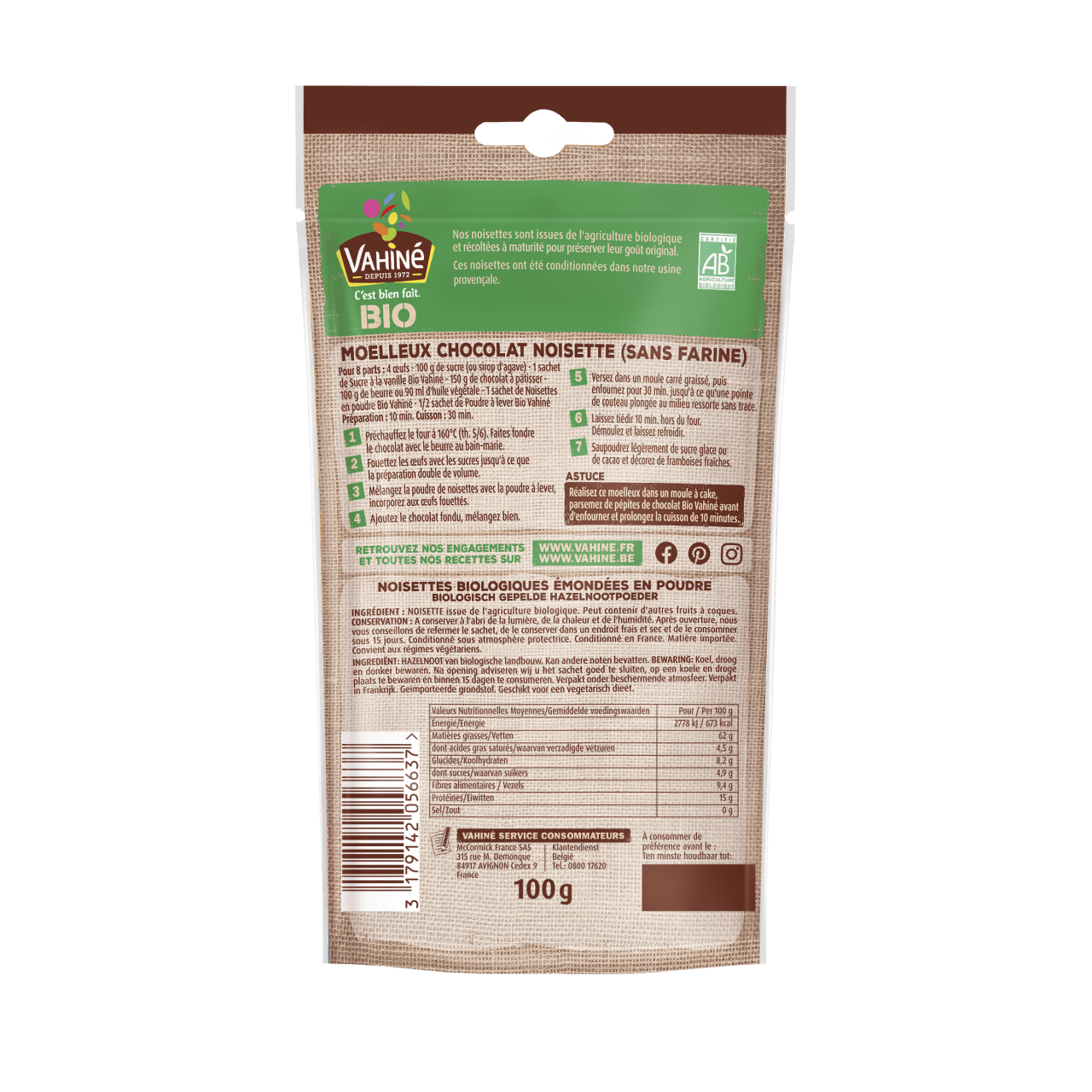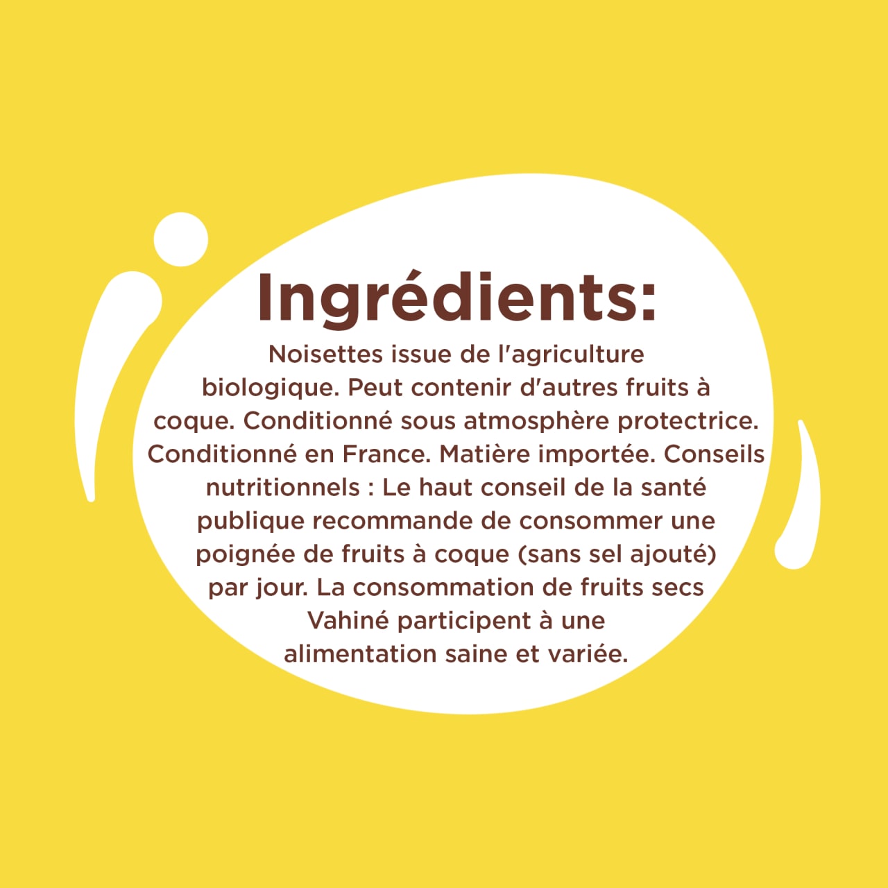 Noisettes issue de l'agriculture biologique. Peut contenir d'autres fruits à coque. Conditionné sous atmosphère protectrice. Conditionné en France. Matière importée.