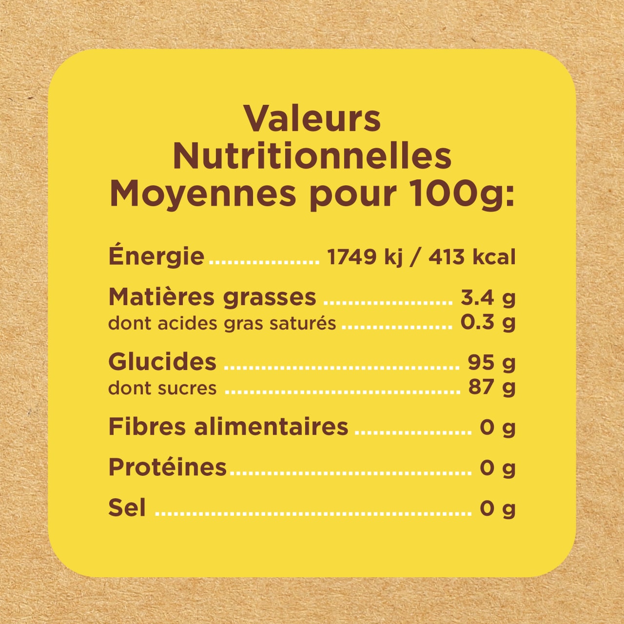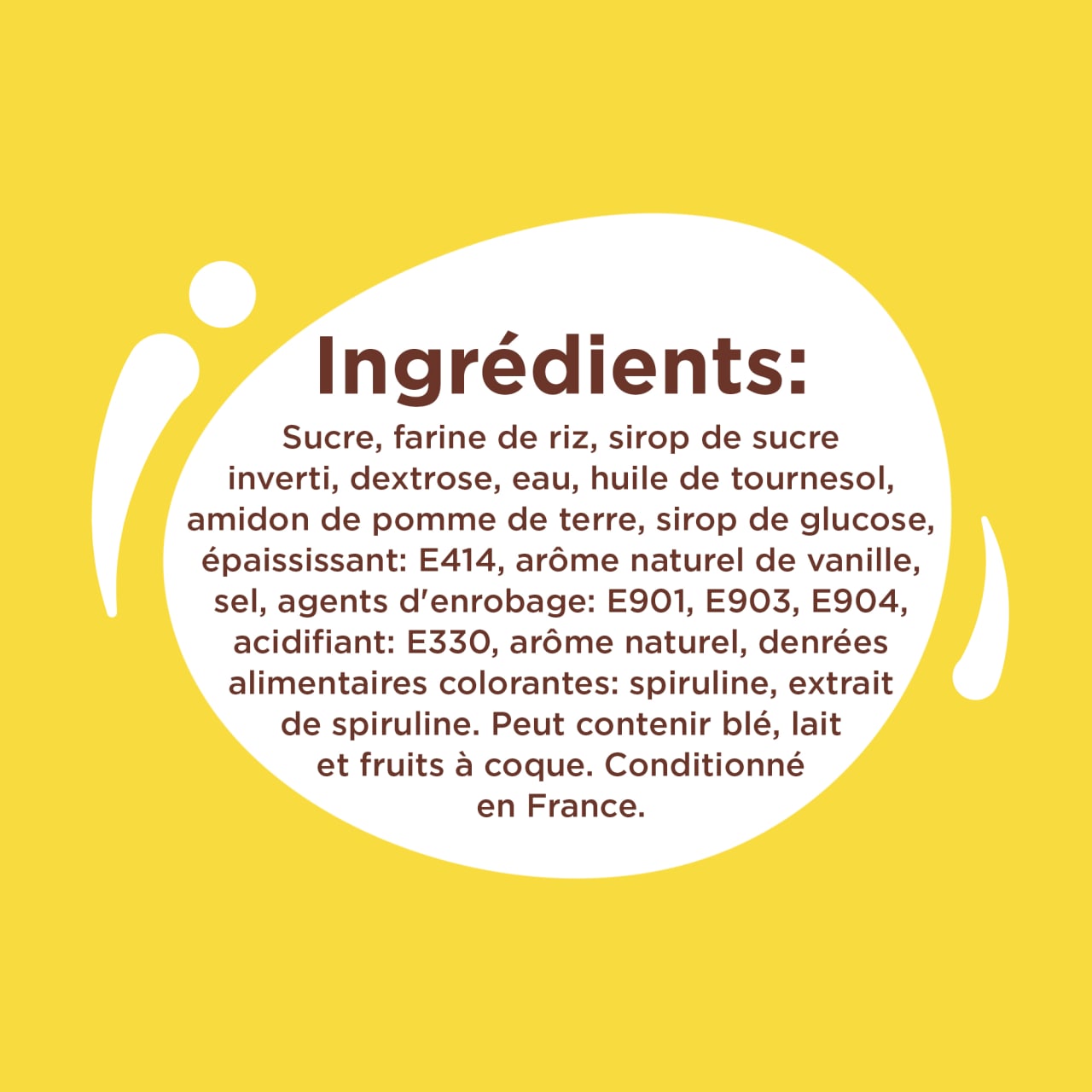 Sucre, farine de riz, sirop de sucre inverti, dextrose, eau, huile de tournesol, amidon de pomme de terre, sirop de glucose, épaississant: E414, arôme naturel de vanille, sel, agents d'enrobage: E901, E903, E904, acidifiant: E330, arôme naturel, denrées alimentaires colorantes: spiruline, extrait de spiruline. Peut contenir blé, lait et fruits à coque. Conditionné en France.