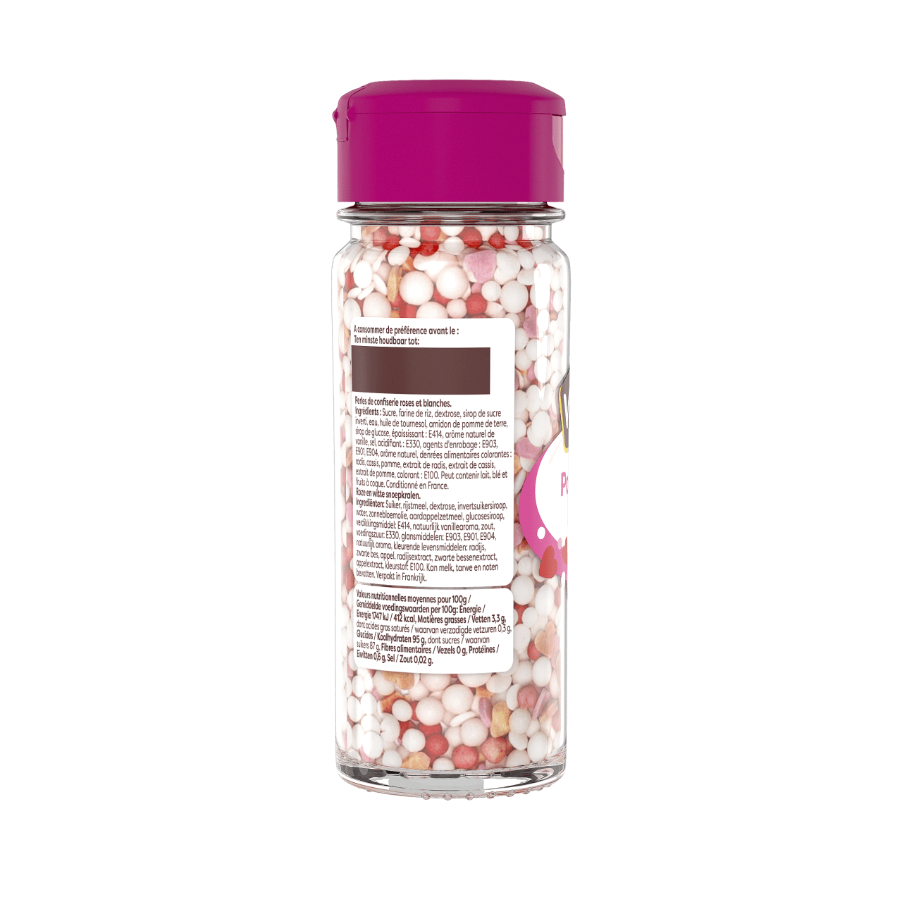 Sucre, farine de riz, dextrose, sirop de sucre inverti, eau, huile de tournesol, amidon de pomme de terre, sirop de glucose, épaississant: E414, arôme naturel de vanille, sel, acidifiant : E330, agents d'enrobage: E903, E901, E904, arôme naturel, denrées alimentaires colorantes radis, cassis, pomme, extrait de radis, extrait de cassis, extrait de pomme, colorant : E100. Peut contenir lait, blé et fruits à coque. Conditionné en France.