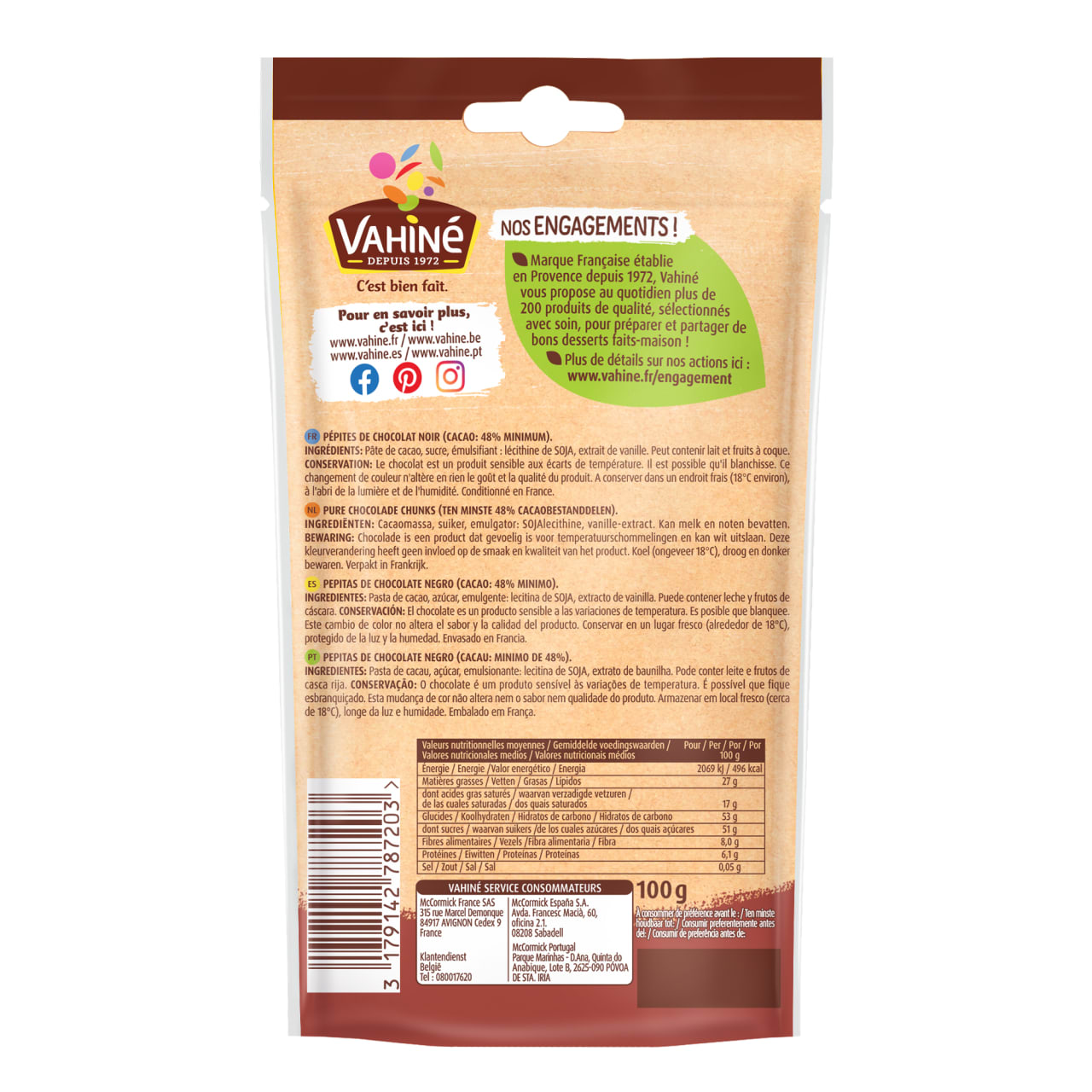 - MORCEAUX GÉNÉREUX : Des chunks de chocolat noir pur beurre de cacao, spécialement pensés pour donner de la gourmandise et du fondant à vos desserts maison.