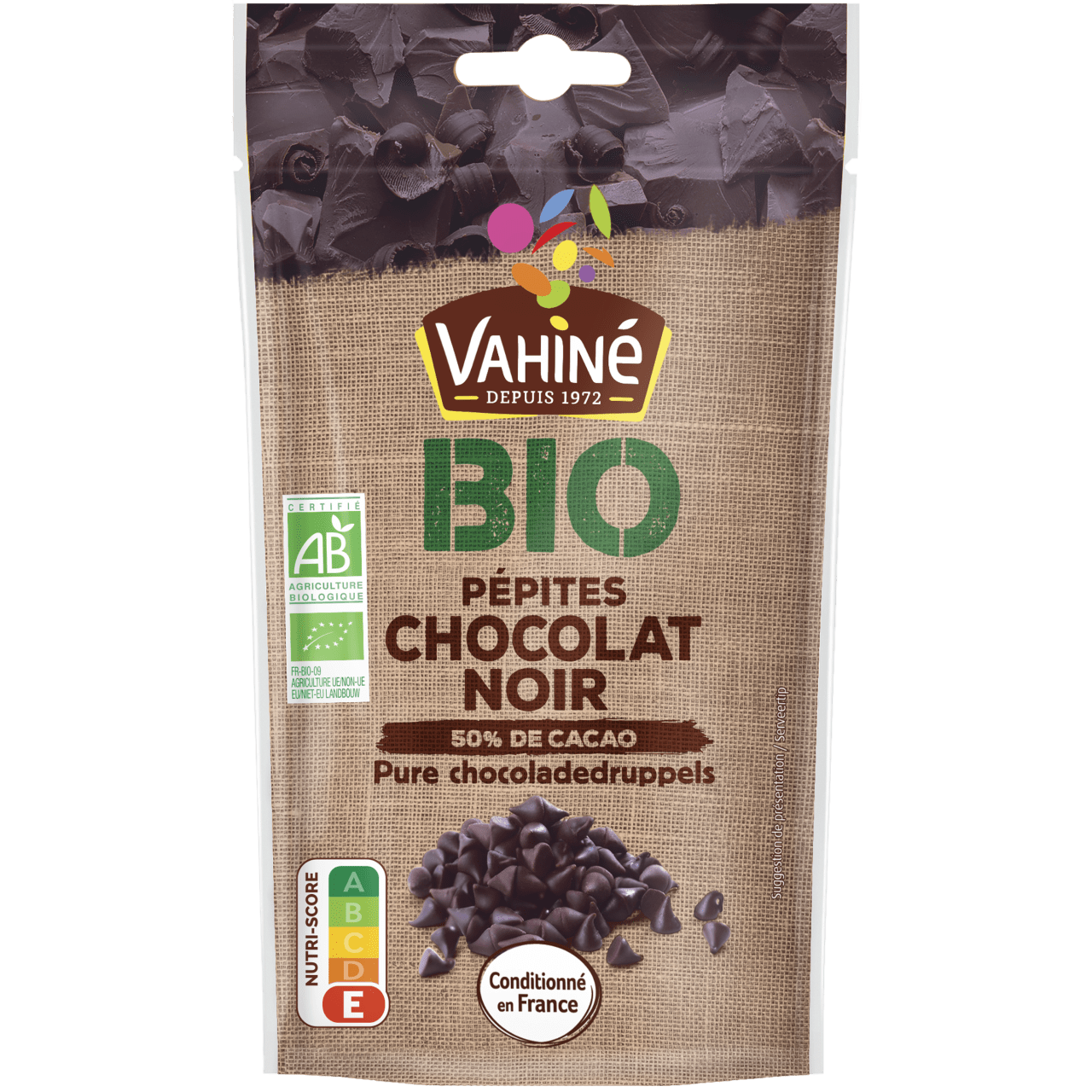 Nos pépites sont de chocolat noir pur beurre de cacao, sans arôme artificiel ni conservateur* et issues de l'agriculture biologique. Nos pépites de chocolat noir bio ont été conditionnées dans notre usine provençale. Nous nous engageons à réduire l'empreinte écologique de notre outil de production, nous réduisons nos déchets au maximum et recyclons presque 70% d'entre eux. *Conformément à la réglementation en vigueur.