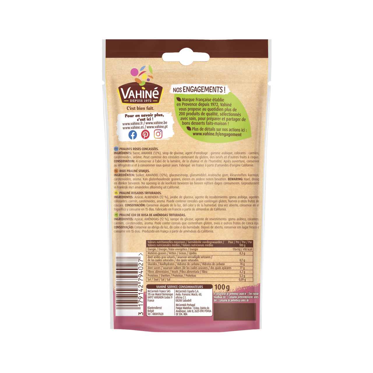 Plus de 50 ans d'expertise pâtissière Vahiné ! Vahiné a sélectionné ces pralines roses concassées pour leur gourmandise et leur croquant. Vous pourrez les grignoter telles quelles ou les ajouter à vos desserts pour leur apporter une touche sucrée et colorée : saupoudrez ces pralines sur vos entremets ou ajoutez-les dans vos pâtes à brioches, cakes, cookies, muffins et tartes ! Vahiné, c'est gonflé !