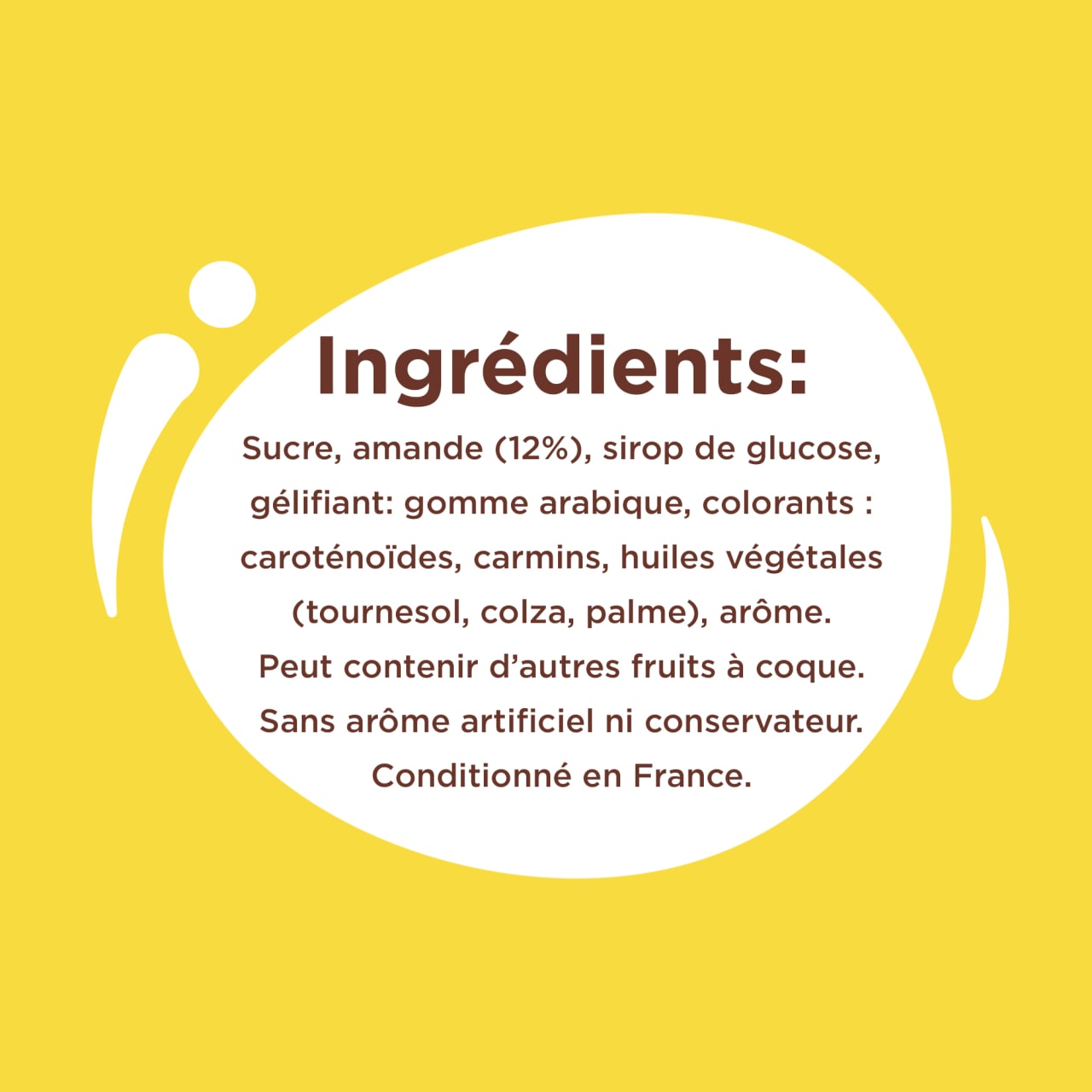 Sucre, amande (12%), sirop de glucose, gélifiant: gomme arabique, colorants : caroténoïdes, carmins, huiles végétales (tournesol, colza, palme), arôme.