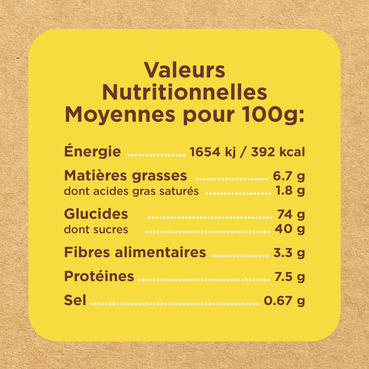 Farine de BLE, sucre, pépites de chocolat noir (sucre, páte de cacao, beurre de cacao, arôme naturel de vanille) (8%), NOISETTES hachées sucrées (8%) (NOISETTE, sucre), poudres à lever: bicarbonate de sodium, citrate monosodique. Chocolat (cacao: 47% minimum). Peut contenir lait, soja, oeuf, amande et autres fruits à coque. Conditionné sous atmosphère protectrice.