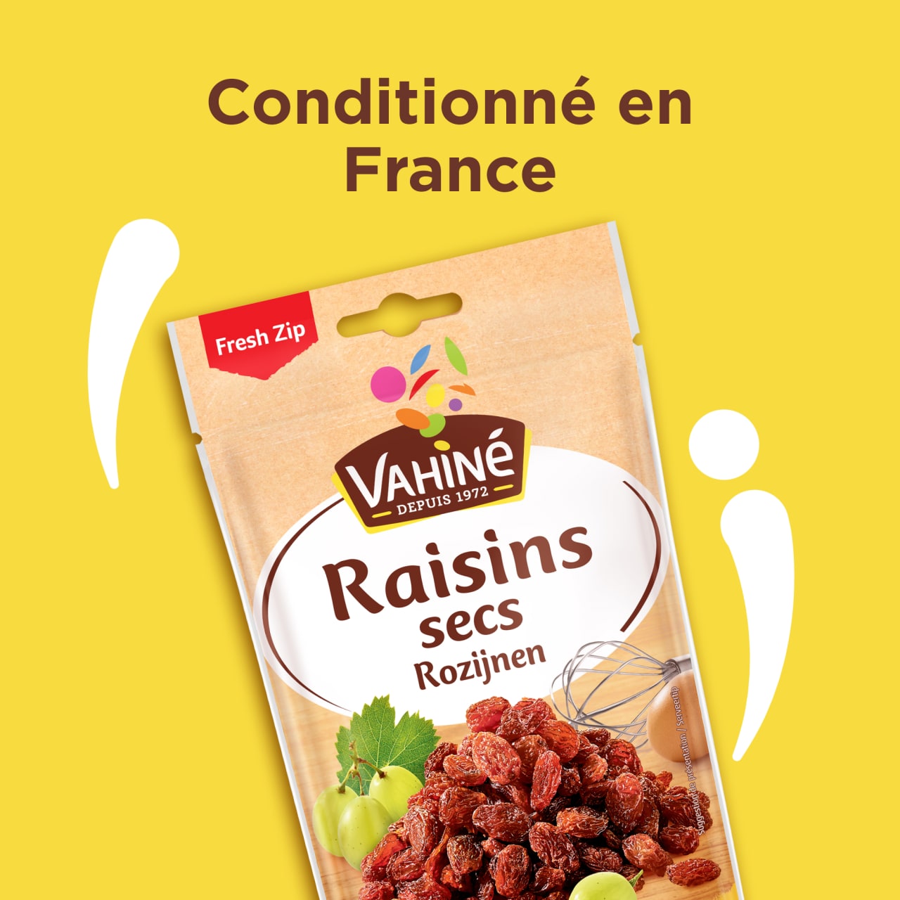 Sélectionnés avec soin, les Raisins Secs Vahiné sont conditionnés en Provence depuis plus de 50 ans. Grâce à leur sachet refermable Fresh Zip, ils gardent toute leur fraîcheur et se conservent faci....