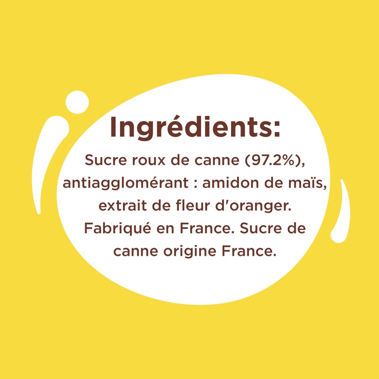 Ingrédients : Sucre roux de canne (97,2%), antiagglomérant : amidon de maïs, extrait de fleur d'oranger.